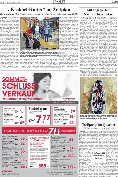 INHALT: Seite 8 I 5. August 2015 Lokales Mit engagiertem Nachwuchs am Start VII. Cup um das Blaue Band von Vegesack Vegesack ,,Wir haben uns für den VII. Cup um das ,Blaue Band von Vegesack` viel vorgenommen", macht Andreas Hoffmann vom Veranstalter Kutterpullteam Vegesacker Jungs e.V. deutlich. Nachdem sich die Mannschaft stark verjüngt hat, geht man jetzt mit einem besonders leistungsstarken Team ins Rennen. Die regelmäßigen Trainingseinheiten haben außerdem das ihre dazu beigetragen. ,,Beim Kutterpullrennen während der Kieler Woche im Juni diesen Jahres haben wir einen tollen zweiten Platz geholt", zeigt sich Hoffmann zufrieden und attestiert dem Nachwuchs, dass er sich inzwischen zu einer wichtigen Stütze im Boot entwickelt hat. Gute Voraussetzungen also, um beim VII. Cup um das ,,Blaue Band von Vegesack" am Sonnabend, 19. September, sich eine gute Zeit auszurechnen. Allerdings: Das Rennen verspricht auch in 2015 wieder spannend zu werden, denn zugesagt haben bereits sehr starke Mannschaften aus Elsfleth und Brandenburg. Gestartet wird das Rennen am Sonnabend, 19. September, um 8 Uhr an der Maritimen Meile in Vegesack in Höhe der Signalstation. Die Rennstrecke beträgt zirka 600 Meter, die Wende erfolgt nach etwa 300 Metern stromabwärts. ,,Wir würden uns freuen, wenn an diesem Tag möglichst viele Wassersportbegeisterte die Mannschaften anfeuern. Auch das macht den Reiz eines spannenden Wettbewerbs aus", sagt Hoffmann weiter. Wie in den vergangenen Jahren kommt das Startgeld in Höhe von 30 Euro je Mannschaft einer wohltätigen Einrichtung zugute. Wer in diesem Jahr bedacht wird, entscheidet sich erst am Ende des Rennens, wenn die Sieger die Empfänger des Preisgeldes festlegen. Traditionell engagieren sich auch bei der siebten Auflage des Cups um das ,,Blaue Band von Vegesack" wieder viele Nordbremer Firmen für den guten Zweck. Sie stellen Tische, Bänke sowie Zelte kostenlos zur Verfügung. Freiwillige Helfer versorgen die Mannschaften und Gäste mit Speisen und Getränken. Während der Regatta werden Spenden für die Seenotretter gesammelt. Weitere Infos unter www. FR vegesackerjungs.de. ,,Krabbel-Kutter" im Zeitplan Gemeinschafts-Pilot-Projekt Krippengruppe zwischen Lürssen, Gemeinde und CVJM Lemwerder In Zeiten von achkräftemangel ist es ichtig, für Arbeitnehmer ute Bedingungen für die Verinbarkeit von Familie und eruf zu schaffen. Das weiß uch die Fr. Lürssen Werft nd die Gemeinde Lemwerer. So wurde kürzlich zwichen der Werft und dem VJM-Sozialwerk Weserarsch ein Kooperationsverrag über eine betriebseigene rippengruppe mit 15 neuen lätzen unterzeichnet. Die Krippengruppe mit dem amen ,,Krabbel-Kutter" ist em Kindergarten des CVJM n der Schlesischen Straße 5 angegliedert, nur ein paar inuten von der Werft enternt. Hier sollen ab Anfang Sepember Kinder bis drei Jahe zwischen 7 und 17 Uhr etreut werden. Dafür wird och einiges umgebaut auf echnung der Werft, die auch inen Großteil der Betriebsosten übernehmen will. Im Rahmen der Vertragsnterzeichnung führte die indergartenleiterin Sabine chulz durch die Einrichung. ,,Wir sind absolut im eitplan", erklärte sie und eranschaulichte den Stand findet laut Leiterin Sabine Schulz nach dem Konzept von der ungarischen Kinderärztin Emmi Pikler statt, die davon ausging, dass sich Kinder am besten entfalten, wenn sie sich möglichst selbstständig entwickeln dürfen. Für die Krippe wird die Mitarbeiterzahl des Kindergartens von 16 auf 20 erhöht. Dies sei eine Premiere, ein Pilotprojekt, bei dem drei Kooperationspartner, Gemeinde, Kindergarten und Werft zusammenarbeiten, betonte Oliver Grün, Media Resations Manager bei Lürssen. Lemwerders Bürgermeisterin Regina Neuke lobte die Flexibilität aller Beteiligten. Die Gemeinde ist zuständig für die Kinderbetreuung in Lemwerder. Diesen Auftrag hat sie vom Landkreis übernommen. Die Krippe bietet zehn feste Plätze für die Lürssen-Mitarbeiter, fünf für die Gemeinde. Anmeldungen gebe es schon. Die Fr. Lürssen Werft konnte bereits eine Mitarbeiterin gewinnen, weil man ihr explizit einen Krippenplatz anbieten konnte, berichtet Lena Ströbele, Personalleiterin der Werft. AS Holger Knoop, Geschäftsführer des CVJM-Sozialwerks, Lemwerders Bürgermeisterin Regina Neuke, Lena Ströbele, Personalleiterin der Fr. Lürssen Werft, Kiga-Leiterin Sabine Schulz und Dr. Ilka Spiess, Fachbereichsleiterin des CVJM-Sozialwerks Wesermarsch FOTOS (2): AS (von links) vor der Baustelle. der Bauarbeiten in den Räumen, in Fluren und im Außengelände. Besonders beeindruckt zeigten sich die Gäste von einem Badezimmer mit ,,Babyspa", einer Badelandschaft für die Kleinen. ,,Das ist unser Highlight im Haus", so die Leiterin. Dem KitaKonzept nach erleben die Jüngsten ,,viel mit Wasser", es wird auch bei jedem Wetter nach draußen gegangen. Die Erziehung in der Einrichtung SOMMER- SCHLUSSVERKAUF Geschirrtücher Handtücher Halbleinen + Baumwolle 50x70 95* Wir räumen unser Warenlager! 3. 7. 1.3.6. 50 Federkissen 100% Federfüllung 80x80 Jersey Spannbettlaken verschiedene Farben Standardgröße 15.-* 100% Baumwolle 50x100 95* Duschtücher Walkfrottier 70x140 12. 95* ck k Stü r Stüc fü 7. 77 Sommer-Bettwäsche Jersey + Satin k Stüc tück 135x200 für S waschbar bis 60°C 135x200 7.95 15.22.Schon ein eingespieltes Team: Die neue Mannschaft des Kutterpullteams Vegesacker Jungs e.V. Das Foto entstand FOTO: FR während des Trainingslagers im April in Leer. Duo-Betten classic 95* 39. EINZELTEILE & RESTBESTÄNDE BIS ZU Halbdaunenkissen Sommerbetten 15% Daunen, 85% Federn 95* 80x80 39. 90% Daunen & 10% Federn 79.-* 135x200 22.33.99.- Visco-Dynamic Matratze Die Symbiose aus Viscoschaum und Kaltschaum. Dieser neuartige Polsterschaum vereint die positiven Eigenschaften von Viscoschaum und Kaltschaum. Er reagiert so druckentlastend wie ein Viscoschaum, verhält sich aber ähnlich temperaturunabhängig und rückstellkräftig wie ein Kaltschaum. 70 Standardgröße Standardgröße % REDUZIERT! 99.-* 