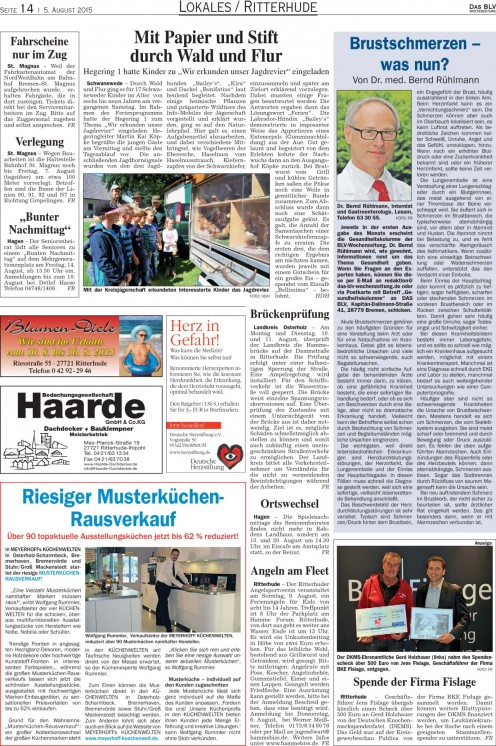 INHALT: Seite 14 I 5. August 2015 Lokales / Ritterhude Fahrscheine nur im Zug St. Magnus Weil der Fahrkartenautomat der NordWestBahn am Bahnhof Bremen-St. Magnus aufgebrochen wurde, erhalten Fahrgäste, die in dort zusteigen, Tickets direkt bei den Servicemitarbeitern im Zug. Bitte auf das Zugpersonal zugehen und selbst ansprechen. FR Mit Papier und Stift durch Wald und Flur Hegering 1 hatte Kinder zu ,,Wir erkunden unser Jagdrevier" eingeladen Schwanewede Durch Wald und Flur ging es für 17 Schwaneweder Kinder im Alter von sechs bis neun Jahren am vergangenen Samstag. Im Rahmen des Ferienprogramms hatte der Hegering 1 zum Thema ,,Wir erkunden unser Jagdrevier" eingeladen. Hegeringleiter Martin Kai Köpke begrüßte die jungen Gäste am Vormittag und stellte den Tagesablauf vor. Die anschließenden Jagdhornsignale wurden von den drei Jagdeinzusammeln und später am Zielort erklärend vorzulegen. Dabei mussten einige Fragen beantwortet werden. Die Antworten ergaben dann das Lösungswort ,,Ferien". Die Labrador-Hündin ,,Bailey`s" demonstrierte in imposanter Weise das Apportieren eines Entenerpels (Gumminachbildung) aus der Aue. Gut gelaunt und begeistert von dem Erlebten kehrte der Nachwuchs dann an den Ausgangshof Köpke zurück. Bei Bratwurst vom Grill und kühlen Getränken saßen die Pökse noch eine Weile in gemütlicher Runde zusammen. Zum Abschluss wurde dann noch eine Schätzaufgabe gelöst. Es galt, die Anzahl der Samentaschen einer Schwarzkiefernzapfe zu erraten. Die ersten drei, die dem richtigen Ergebnis am nächsten kamen, wurden jeweils mit einem Gutschein für ein großes Eis gespendet vom Eiscafè Mit der Kreisjägerschaft erkundeten interessierte Kinder das Jagdrevier. ,,Bellissima" beFOTO: HDH lohnt. HDH hunden ,,Bailey`s", ,,Kira" und Dackel ,,Bonifatius" laut heulend begleitet. Nachdem einige heimische Pflanzen und präparierte Wildtiere des Info-Mobiles der Jägerschaft vorgestellt und erklärt wurden, ging es auf den Naturlehrpfad. Hier galt es, einen Aufgabenzettel abzuarbeiten, und dabei verschiedene Mitbringsel, wie Vogelbeeren der Eberesche, Haselnuss vom Haselnussstrauch, Kiefernzapfen von der Schwarzkiefer, Brustschmerzen was nun? Von Dr. med. Bernd Rühlmann ein Engegefühl der Brust, häu g ausstrahlend in den linken Arm. Beim Herzinfarkt kann es ein ,,Vernichtungsschmerz" sein. Die Schmerzen können aber auch im Oberbauch lokalisiert sein, es kann Luftnot auftreten. Als bedrohliche Zeichen kommen kalter Schweiß, Unruhe, Angst und das Gefühl, umzukippen, hinzu. Wenn noch ein erhöhter Blutdruck oder eine Zuckerkrankheit bekannt sind oder ein früherer Herzinfarkt, sollte keine Zeit verloren werden. Die Lungenembolie ist eine Verstopfung einer Lungenschlagader durch ein Blutgerinnsel, das meist ausgehend von einer Thrombose der Beine verschleppt wird. Sie äußert sich in Schmerzen im Brustbereich, die typischerweise atemabhängig sind, vor allem aber in Atemnot und Husten. Die Atemnot nimmt bei Belastung zu, und es fehlt das verschärfte Atemgeräusch des Asthmatikers. Wenn zusätzlich eine einseitige Beinschwellung oder Wadenschmerzen auffallen, unterstützt das den Verdacht einer Embolie. Beim Einriss der Hauptschlagader kommt es plötzlich zu heftigen, sogar heftigsten, scharfen oder stechenden Schmerzen im vorderen Brustbereich oder im Rücken zwischen Schulterblättern. Damit gehen sehr häu g eine große Unruhe, sogar Todesangst und Schwitzigkeit einher. Bei diesen Krankheitsbildern besteht immer Lebensgefahr, und es sollte so schnell wie möglich ein Krankenhaus aufgesucht werden, möglichst mit einem Krankentransport. Manchmal ist eine Diagnose schnell durch EKG und Labor zu stellen, manchmal bedarf es auch weitergehender Untersuchungen wie einer Computertomogra e. Häu ger aber sind nicht so schwerwiegende Krankheiten die Ursache von Brustbeschwerden. Meistens handelt es sich um Schmerzen, die vom Skelettsystem ausgehen. Sie sind meist scharf oder brennend und durch Bewegung oder Druck auszulösen. Es fehlen die oben aufgeführten Alarmzeichen. Auch Entzündungen des Rippenfells oder des Herzbeutels können, dann atemabhängige, Schmerzen auslösen. Sogar das Sodbrennen durch Rück uss von saurem Magensaft kann die Ursache sein. Bei neu auftretendem Schmerz im Brustkorb, der nicht sicher zu beurteilen ist, sollte ärztlicher Rat eingeholt werden. Das gilt besonders dann, wenn er mit Alarmzeichen verbunden ist. Verlegung St. Magnus Wegen Bauarbeiten ist die Haltestelle Bahnhof St. Magnus noch bis Freitag, 7. August (tagsüber) um etwa 100 Meter vorverlegt. Betroffen sind die Busse der Linien 90, 91, 92 und N7 in Richtung Gröpelingen. FR ,,Bunter Nachmittag" Hagen Der Seniorenbeirat lädt alle Senioren zu einem ,,Bunten Nachmittag" auf dem Mehrgenerationenplatz am Freitag, 14. August, ab 15.30 Uhr ein. Anmeldungen bis zum 10. August bei Detlef Haese Telefon 04746/1406. FR Dr. Bernd Rühlmann, Internist und Gastroenterologe, Lesum, FOTO: FR Telefon 63 30 55. Jeweils in der ersten Ausgabe des Monats erscheint die Gesundheitskolumne der BLV-Wochenzeitung. Dr. Bernd Rühlmann wird, wie gewohnt, Informationen rund um das Thema Gesundheit geben. Wenn Sie Fragen an den Experten haben, können Sie diese per E-Mail an redaktion@ das-blv-wochenzeitung.de oder via Postkarte mit Betreff ,,Gesundheitskolumne" an DAS BLV, Kapitän-Dallmann-Straße 41, 28779 Bremen, schicken. Akute Brustschmerzen gehören zu den häu gsten Gründen für eine Vorstellung beim Arzt oder für eine Notaufnahme im Krankenhaus. Dabei gibt es lebensbedrohliche Ursachen und viele nicht so schwerwiegende, auch Bagatellursachen. Die häu g nicht einfache Aufgabe der behandelnden Ärzte besteht immer darin, zu klären, ob eine gefährliche Krankheit besteht, die einer sofortigen Behandlung bedarf, oder ob es sich um Beschwerden durch eine lästige, aber nicht so dramatische Erkrankung handelt. Vielleicht kann der Betroffene selbst schon durch Beobachtung von Schmerzen und Begleitumständen m