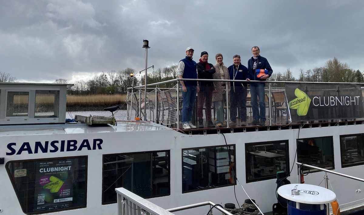 Erstmals ist die MS Sansibar mit dabei. Hier trafen sich vorab zum Gespräch die Organisatoren Jakob Fraisse, Martin Zemke, Elvira Krol, Uwe Schröter und Jürgen Möller (von links). Infos gibt es unter www.der-bremer-norden.de/events/jazzahead-clubnight-bremen-nord/ und jazzahead.de. Foto: as