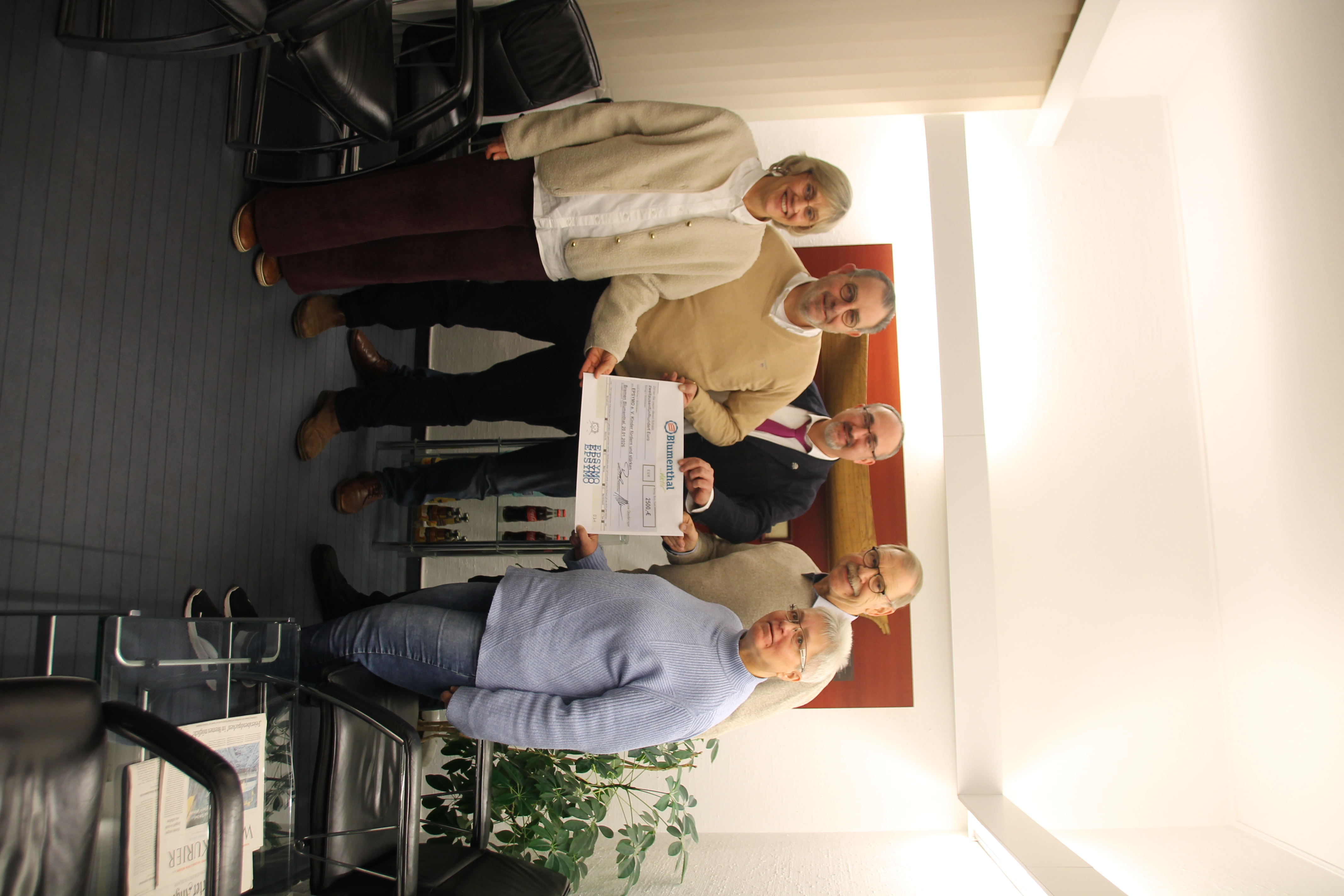 Maren Maetze und Gitta Quillfeldt von Epsymo e.V. freuen sich über den symbolischen Scheck über 2500 Euro von Blumenthal aktiv, überreicht von Oliver Berger, Carsten Thielbar und Fritz-Dieter Regensdorff. Foto: nik
