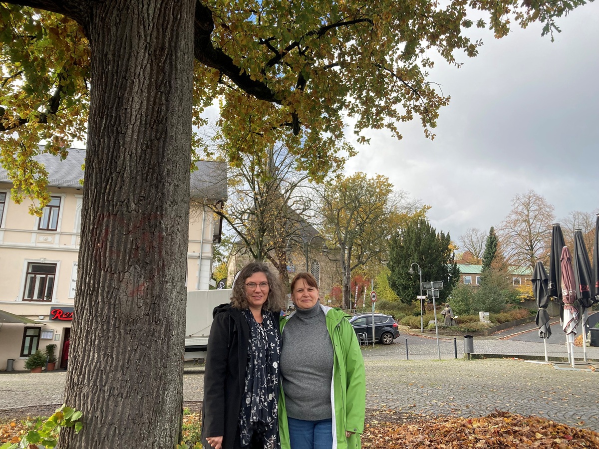 Rings um die in der Weihnachtszeit beleuchteten Eiche wird der Weihnachtsmarkt zelebriert. Christa Dohmeyer (rechts) und Manuela Schütt vom IGEL e. V. laden zudem zum Gewinnspiel ein. Foto: as