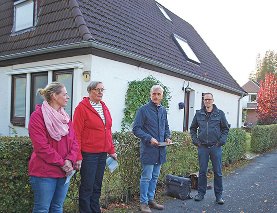 Arne König vom Bauamt Bremen-Nord und Siegfried Hafke, Vertreter der Senatorin für Klimaschutz, Umwelt, Mobilität, Stadtentwicklung und Wohnungsbau (von rechts) im Gespräch mit Anwohnern der Straße Waldwinkel. Im Hintergrund ist eins der typischen Häuser zu sehen. Foto: AS