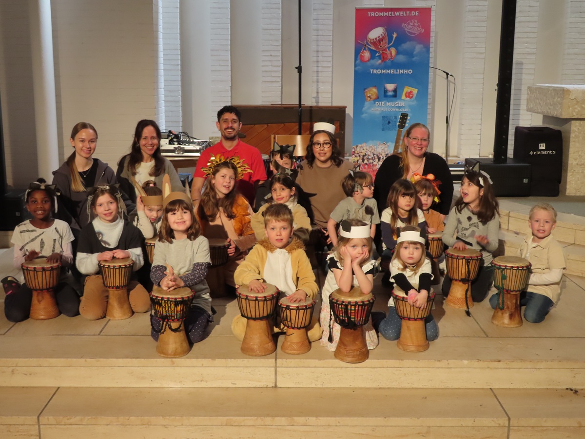 Sie berichten weiter: „Schon beim Betreten der Räume wird deutlich: Hier wird nicht nur geübt, sondern erlebt. Überall wird getrommelt, gesungen und getanzt. Die Kinder lernen spielerisch verschiedene Rhythmen kennen und entwickeln dabei ein Gefühl für Musik, Gemeinschaft und Ausdruck. Im Mittelpunkt steht dabei die Geschichte von „Trommelinho“, einer fantasievollen Figur, die die Kinder auf eine Reise rund um die Welt mitnimmt.