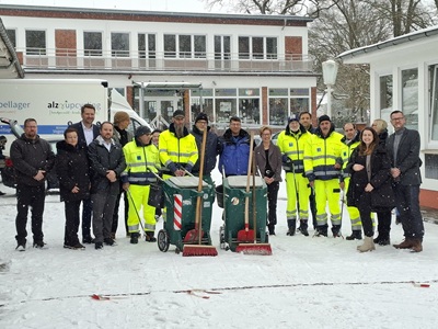 Die drei Nordbremer Ortsamtsleiter, Sozialsenatorin Dr. Claudia Schilling, alz-Geschäftsführerin Susanne Hirsch und Kollegen begrüßten die fünf neuen in gelb gekleideten Umwektwächter.Foto: rdr