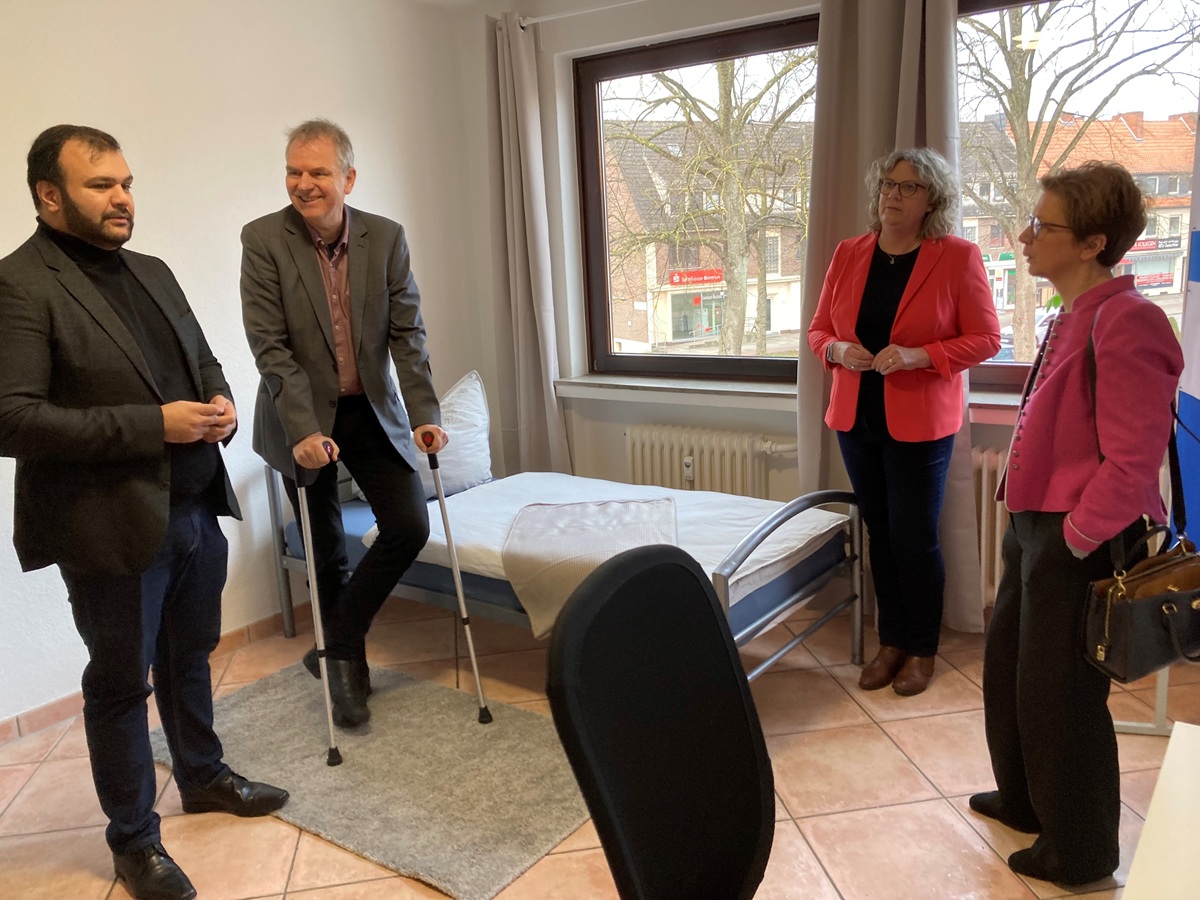 Sozialsenatorin Dr. Claudia Schilling, WaBeQ-Geschäftsführerin Birgit Füllgrabe-Frede, Rolf Diener, Abteilungsleiter „Junge Menschen und Familie“ bei der senatorischen Behörde, Fachbereich Junge Menschen, und Assil Amin, Bereichsleitung Pädagogik bei der WaBeQ (von rechts) schauten sich eins der Zimmer an. Foto: as