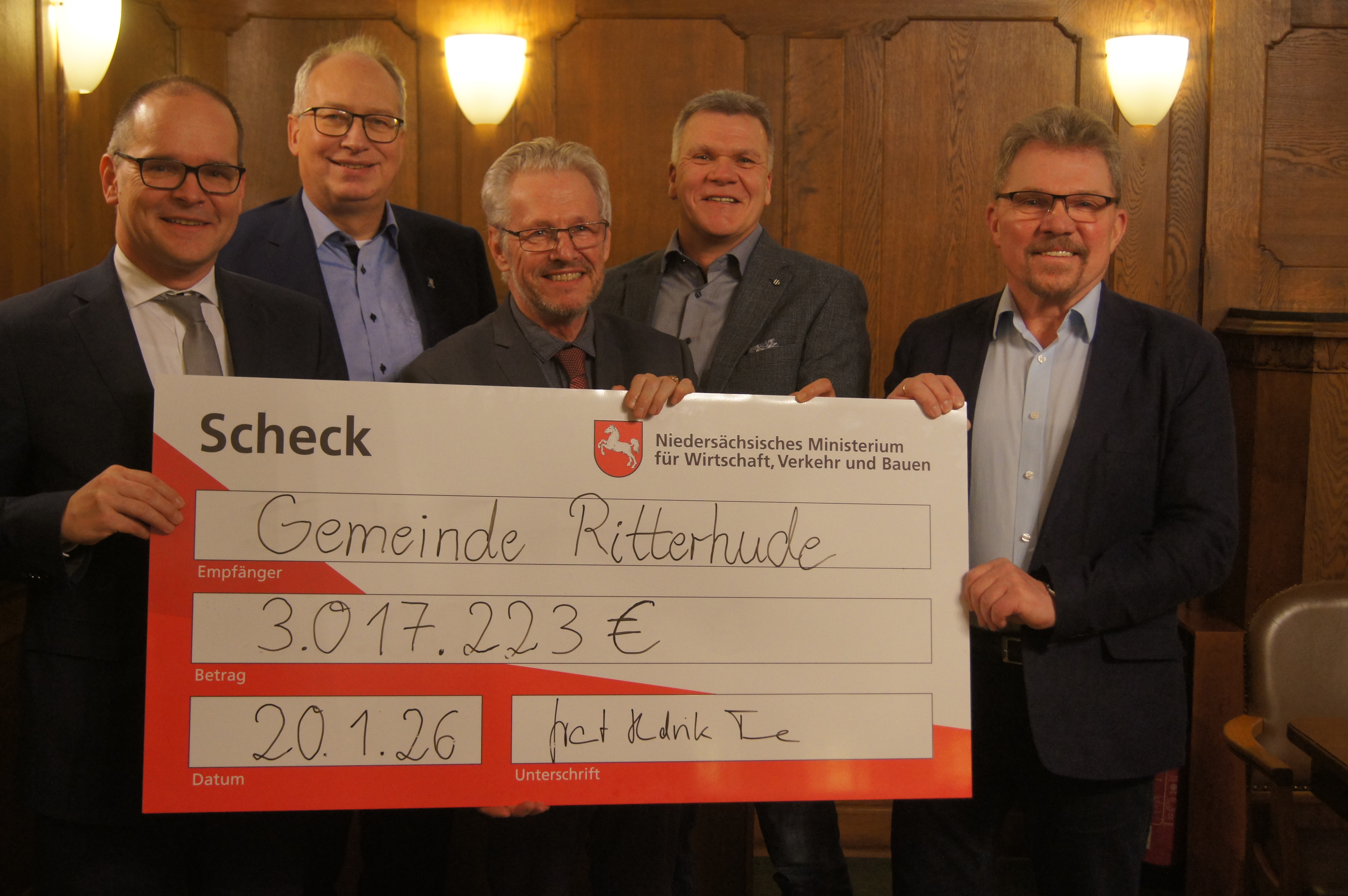 Ritterhude – (th) Ein nachhaltiges Zukunftsprojekt wird in der Gemeinde Ritterhude entstehen. Niedersachsens Wirtschaftsminister Grant Hendrik Tonne überreichte Bürgermeister Jürgen Kuck einen symbolischen Scheck, der die Gesamtsumme von drei Millionen Euro überschreitet. Damit verbunden ist ein Zuwendungsbescheid aus Mitteln der Gemeinschaftsaufgabe „Verbesserung der regionalen Wirtschaftsstruktur“, kurz GRW. Für die Hammegemeinde ein großer Grund zur Freude. Schließlich kann sie mit dem Geldsegen notwendige Infrastrukturmaßnahmen für das 2,4 Hektar große Areal finanzieren, dass durch Nachhaltigkeit und Energieeffizienz einen besonderen Modellcharakter genießen wird.