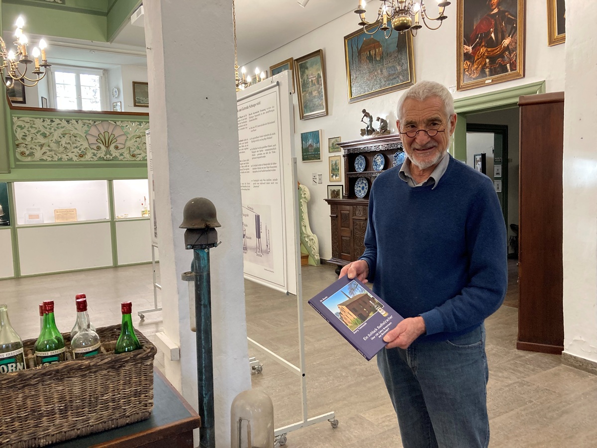 Georg Tosonowski in der Ausstellung im Schloss mit seinem Buch „Ein Schluck Sudholz‘scher – Über 130 Jahre Branntwein aus Beckedorf. Foto: as