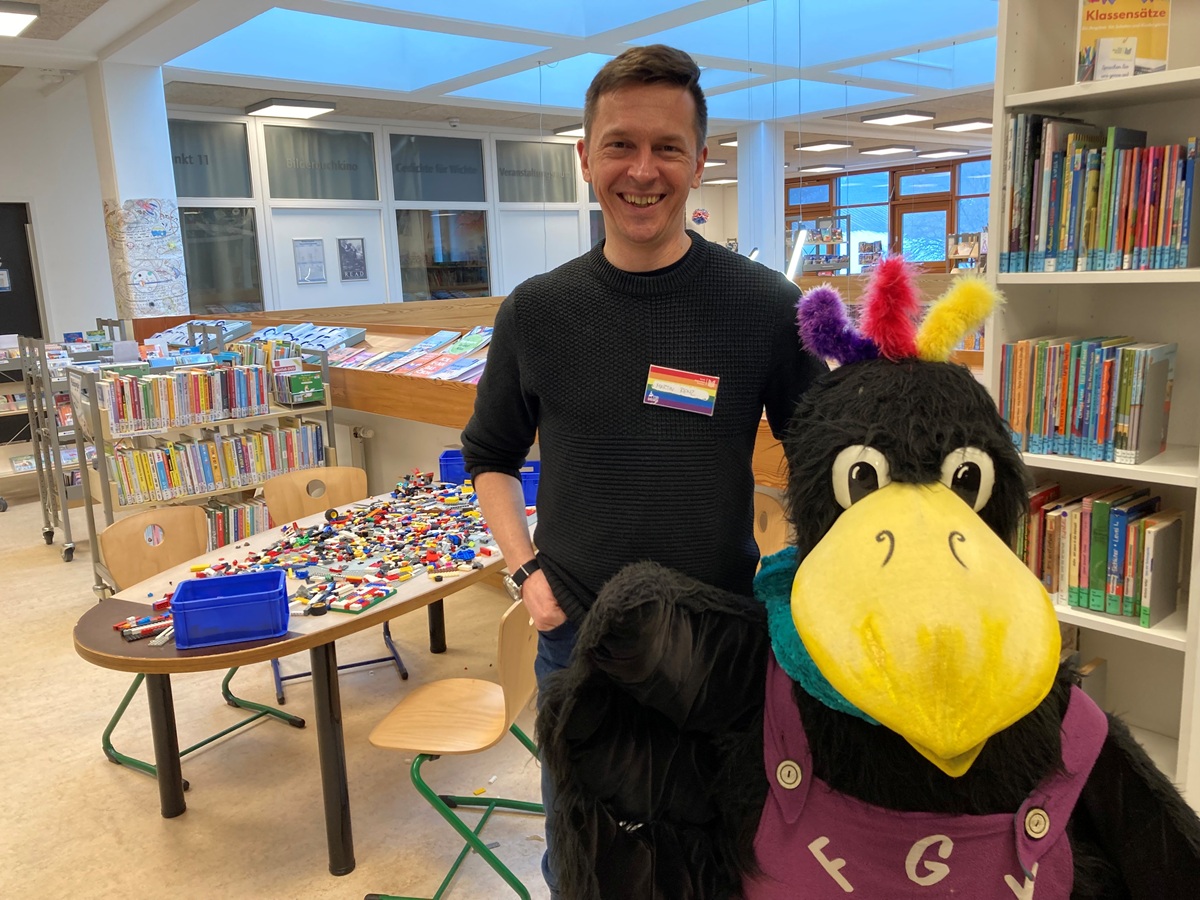Leiter Martin Renz mit dem Bibliotheksmaskottchen Kessi. Foto: as