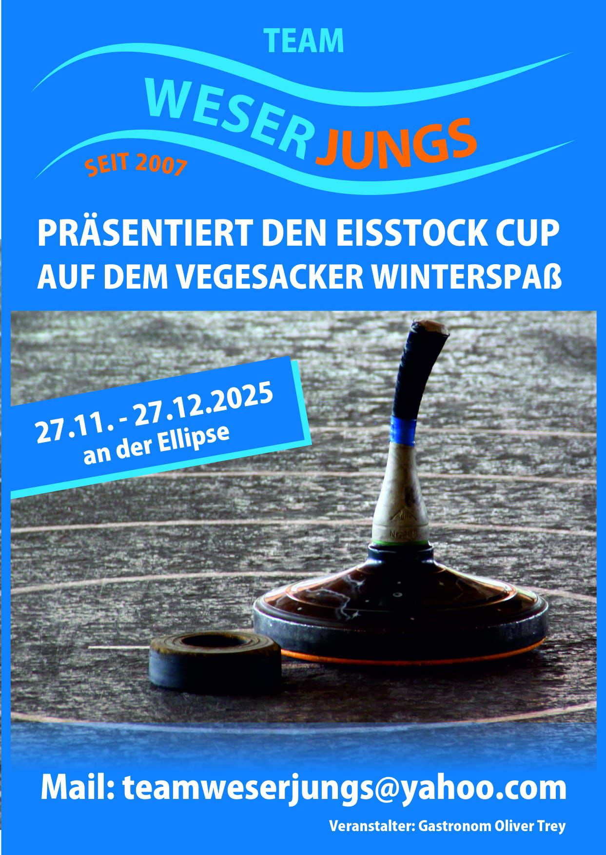 Vegesack – (rdr) Der Vegesacker Eisstockcup findet in diesem Jahr wieder statt. Das Team Weserjungs präsentiert ihn in Zusammenarbeit mit dem Veranstalter des Vegesacker Winterspaß, dem Gastronomen Oliver Trey. Geplant ist, dass im Zeitraum vom 27. November bis 18. Dezember jeweils am Dienstag und Donnerstag die Vorrunden, am Samstag, 20. Dezember, das Halbfinale und am Samstag, 27. Dezember, das Finale gespielt werden.