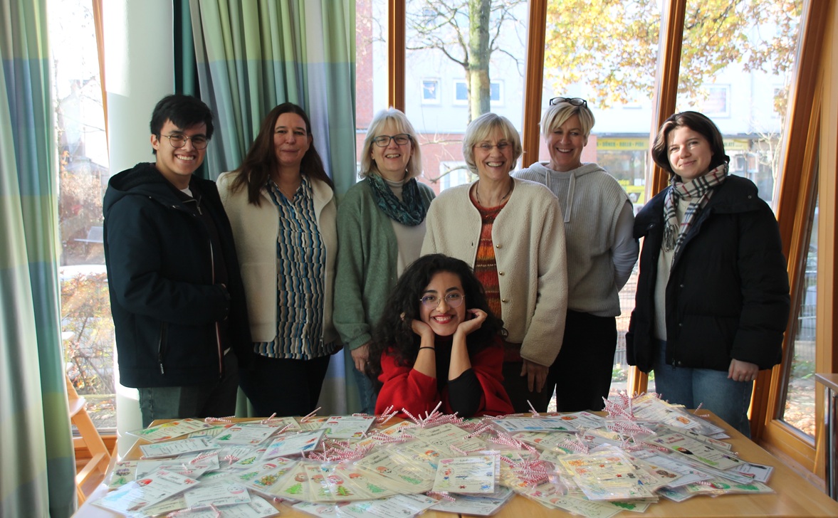 Mit über 300 Wunschzetteln: Student Pablo Vasquez, Stefani Vogt von der Kita Fillerkamp, Elke Schött und Maren Maetze von Epsymo e.V., Community-Managerin Gabriela Yanez (vorn), Manuela Stickan von der Kita Neuenkirchener Weg und Studentin Sophia Kirillova. Foto: nik